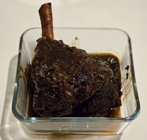 Verhit de volgende dag een pan op middelhoog vuur met een dunne laag olijfolie en schroei de lamsschenkel rondom dicht. Voeg fijn gesnipperde ui en in kleine stukken gesneden tomaat toe en roer regelmatig. Het mengsel kan er op sommige momenten donker uitzien. Dat is niet direct een probleem zolang het niet verbrandt. Wordt de pan wat donkerder, dan is dat dus nog niet meteen een probleem. Het is geen tuchtklacht, alleen karamellisatie.